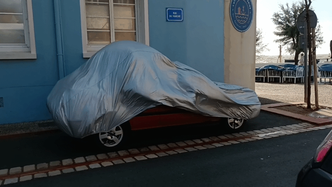 (Les fortes pluies du matin ont trouvé le chemin pour entrer dans la maison.) Je sors la serpillière et la bassine. Je porte le vélo de Benjamin chez le réparateur du marché, qui n’est pas présent sur le marché. La réparation attendra. Avec l’interview téléphonique du début d’après-midi, j’ai l’impression d’avoir fait tout ce qu’il est raisonnable de faire un jour de pluie et de tempête. J’envoie un ou deux derniers mails et je me décrète en week-end. Je file voir la mer, qui est grosse, et dont l’écume vient régulièrement lécher les ganivelles, pourtant hautes sur la plage. J’aime bien connaître ce mot, » ganivelle « , même si, quand il arrive que je le cherche, c’est cet autre, » barbacane « , qui me vient à l’esprit. La housse de protection d’une voiture garée face à la mer offre ce spectacle assez amusant d’être ballottée par le souffle incessant du vent. Je ne suis pas certain qu’elle passe l’après-midi.