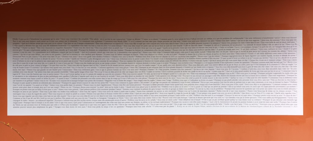 Il me manque au moins une heure de sommeil. Je ne vais pas courir et somnole dans le canapé pour tenter d’émerger. Je prépare les épreuves pour les ateliers de cet après-midi. La factrice sonne pour me proposer ses calendriers. Elle dépose sur la table une pile épaisse de vues de chatons dans des corbeilles de fruits, ou de chevaux galopant dans des gerbes d’eau. Je prends le troisième de la pile, les vieilles affiches publicitaires. Je tape dans la tirelire de Benjamin. Nous préparons la colle avec les étudiants, tentons de faire tenir un scotch sur un mur humide, et nous lançons dans le collage de notre affiche XXL, avec plus ou moins de réussite : ça plie, ça bulle. On arrange les choses tant bien que mal à grands coups de brosse à maroufler. Un gars des services techniques de l’université regarde notre chantier d’un sale œil. Je me colle de la colle sur mon pull.