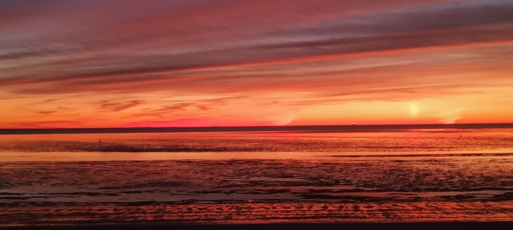 Le soleil se couche au bout de la rue, c’est l’époque de l’année où ils peuvent être impressionnants. C’est le cas ce soir. Il fait froid sur la plage, mais nous migrons en famille pour profiter de la vue.