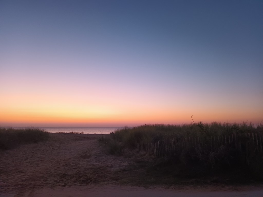 Je cours 53 minutes. L’aube est pastel, c’est très beau. Là, je n’ai aucun scrupule à courir, cela compte même parmi les moments essentiels de ma semaine. Je longe au lever du jour une plage, des petites dunes, le quai d’un minuscule port de plaisance, un chemin qui serpente le long d’enrochements de protection, une seconde plage, une cale de mise à l’eau, d’anciennes maisons d’ostréiculteurs reconverties en restos, des mosaïques piscicoles, des bassins ostréicoles, une roselière, des marais salés, des carrelets, des oiseaux, la mer haute ou basse dans la baie.