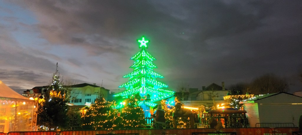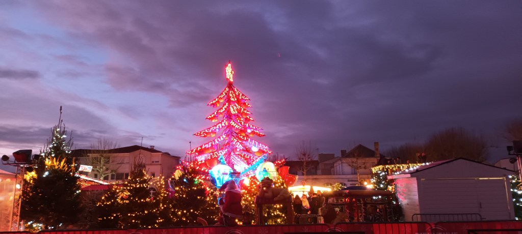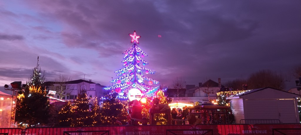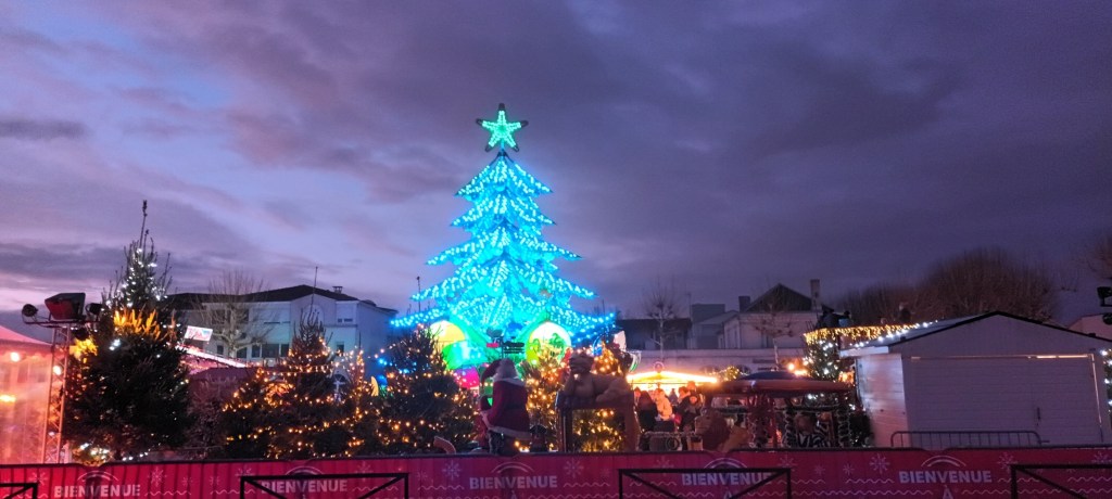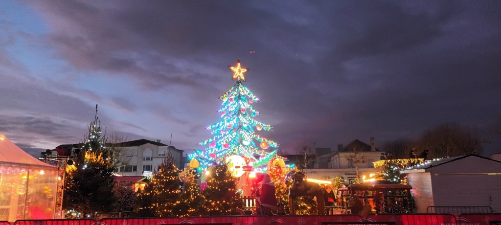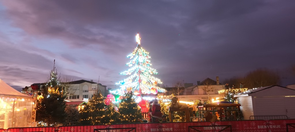Je vais acheter de la moutarde douce. Sur la place à côté de la supérette, le marché de Noël y va franco sur les lumières.