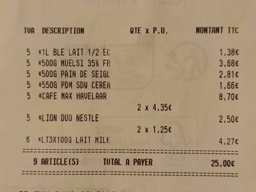Je passe à la supérette pour m’acheter des trucs gras et sucrés, et réassortir l’épicerie familiale. Après deux fois 15€ tout rond (le même jour qui plus est) et une fois 10€ tout rond, le montant de mes courses se portent cette fois-ci à 25€ tout rond.
