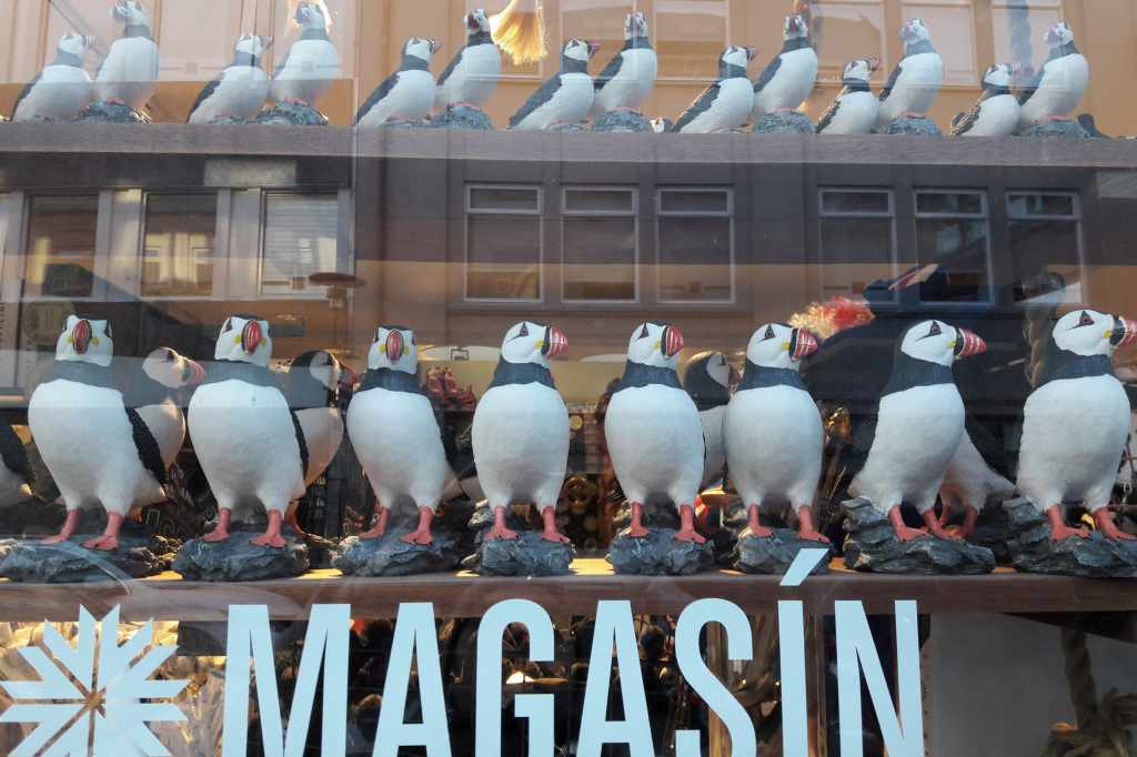 « Le reflet du visage d’une femme blonde se confond, dans la vitrine d’une boutique de souvenirs, avec les alignements de figurines de macareux moines. Le jeu des lumières et des surimpressions de couleurs, entre l’intérieur du magasin et la rue, désoriente le regard et donne un tour angoissant à cette scène anodine. » (En réalité, on ne voit aucun visage parmi les reflets, et le tableau n’est particulièrement angoissant.)