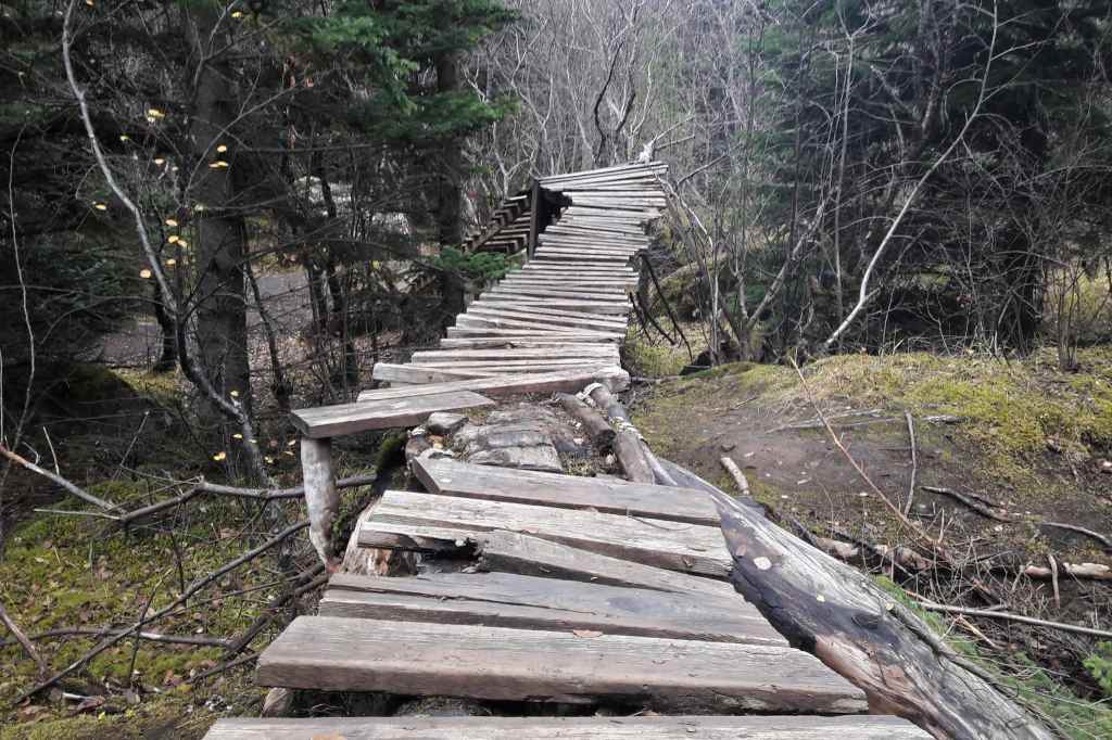 « Dans une forêt, une passerelle de bois sommairement bricolée serpente entre les arbres et donne l’impression, par un effet de perspective, de se perdre dans les branchages. En regardant mieux, on distingue que son extrémité rejoint en fait un chemin de terre brune. »