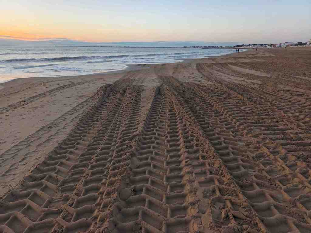 - Les camions-benne sur la plage roulent à toute vitesse sur le sable humide.