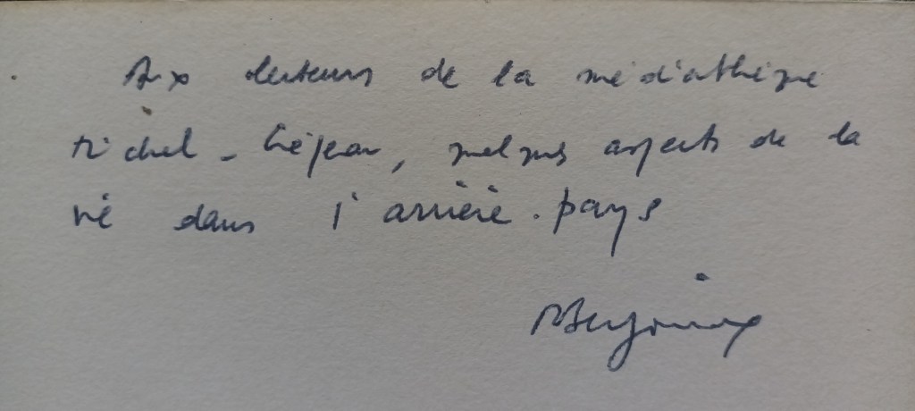 Je lis Un peu de bleu dans le paysage, de Pierre Bergounioux, dans l’après-midi. Le livre est dédicacé, dans la première page, au stylo-bille bleu « Aux lecteurs de la médiathèque Michel-Crépeau, quelques aspects de la vie dans l’arrière-pays ». La reliure s’apprête à lâcher.
